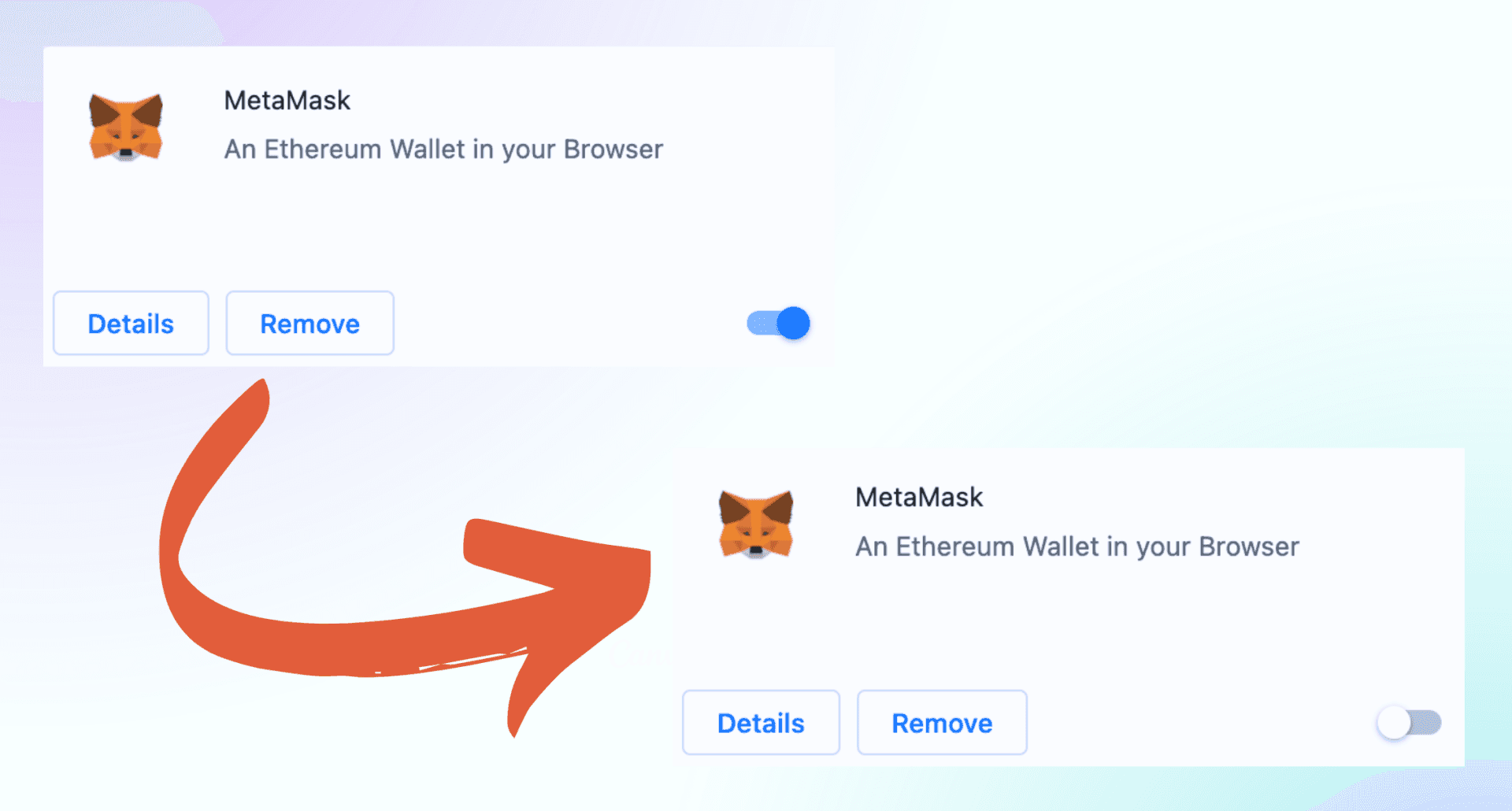 Once you find Metamask, you will see a toggle switch next to it. Click on this switch to disable the extension. You can reenable it any time. When the switch is in the off position, Metamask is disabled, and you should be all set.