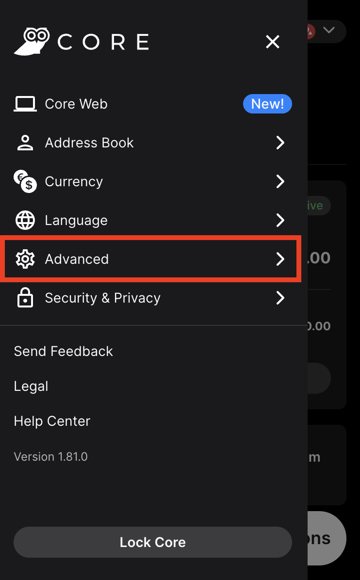 To switch to Testnet Mode, open the Core browser extension, click on the burger menu, then Advanced, and finally activate Testnet Mode.